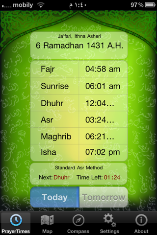 تحديد القبلة ليست هي المهمة الرئيسية للبرنامج -وان كانت الاكثر تركيزا واهتماما فيه- ولكن يبتدأ البرنامج بشاشة توضح فيها أوقات الصلوات لليوم الحالي واليوم التالي. بالاضافة الى تاريخ اليوم الهجري والوقت المتبقي للصلاة القادمة، والميزة الاخيرة لطيفة وتساعد الشخص على الاستعداد لموعد صلاته القادمة واخذ الحسبان لها. هذا غير ان البرنامج يقوم بالتنبيه بأوقات الصلاة حتي ولو كان البرنامج مغلق لكن هذه الخاصية تعمل فقط علي فيرموير 4.0 او اكثر ويجب تفعيلها من اعدادت البرنامج.