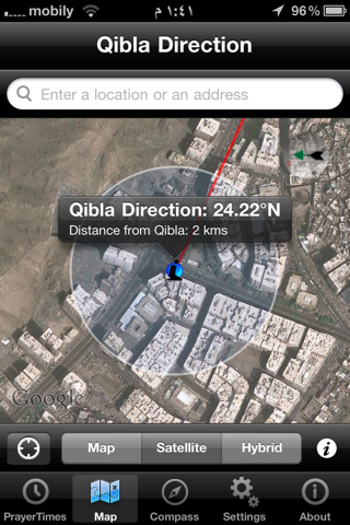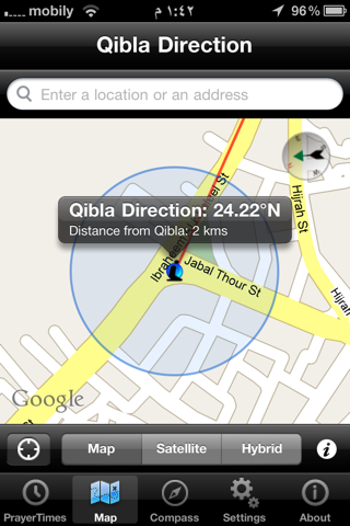 القسم الثاني من البرنامج والرئيسي يقوم بتحديد القبلة لك بشكل دقيق، ليس هذا فحسب بل يظهر خريطة كاملة لموقعك وبثلاثة انماط -بحسب مزايا خرائط جوجل- بالاضافة الى زواية اتجاه القبلة وخط احمر مباشر من موقعك الى الكعبة المشرفة متبوعة بالمسافة من مكانك اليها بالكيلو متر. يمكنك ايضا من خلال هذه النافذة البحث عن الموقع او العنوان المقصود ان اردت ذلك.