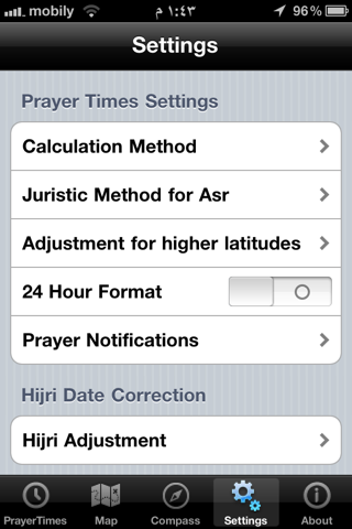القسم الاخير من البرنامج يمثل الاعدادات الخاصة بالبرنامج والتي تمكنك من تهيئته وتخصيصه بما يناسب مذهبك الاسلامي او مكانك الجغرافي والزمني، حيث يمكنك مثلا اختيار طريقة الحساب للتقويم من طرق متعددة كتقويم ام القرى او الجمعية المصرية مثلا او حتى تخصيصه بتحديد الزوايا الجغرافية لكل فرض.