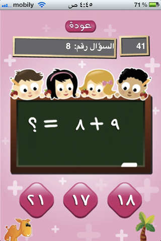 اما القسم الثالث والاخير فهو قسم الحساب الذي يحتوي على مايشبه المسابقة في العمليات الرئيسية وهي الجمع والطرح والضرب والقسمة، بحيث يحتوي كل قسم على عشرة أسئلة وضمن توقيت تصاعدي يطلب من الطفل ان يجيب على الناتج للعملية المعنية من خلال اختيار رقم الناتج الصحيح من خلال ثلاث اجابات، ولا يكتف البرنامج بذلك بل يظهر النتيجة التي حصلت عليها من عدد الاسئلة المجابة ومجموع التوقيت والنسبة المئوية.
