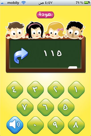 في قسم الأصوات يتبع التطبيق طريقة جميلة في تعليم الاطفال نطق هذه الارقام شفاهة واقرانها بالرقم المكتوب، حيث يقدم وعلى لوح سبورة تقليدي رقم من ثلاث خانات وعلى الطفل اختيار الرقم المطابق بواسطة لمسه من لوحة الارقام ومن اليسار الى اليمين، حيث يمكن اتباع الرقم المكتوب وسماع قرائته، او اقفال الصوت والاكتفاء بالرقم المكتوب.