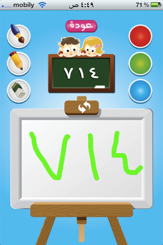 في حالة كتابة الرقم بشكل صحيح يتم الانتقال الى الرقم التالي بعد تهنئة الطفل صوتيا ومرئيا بذلك او في حال الخطآ يطلب منه اعادة المحاولة حتى ينجح.