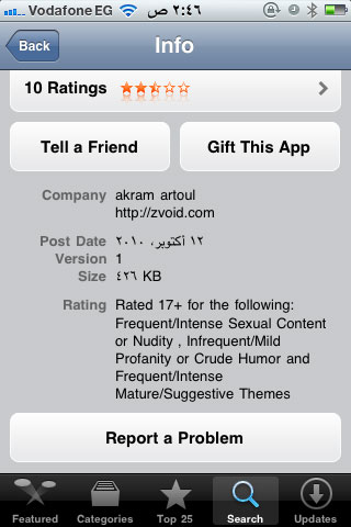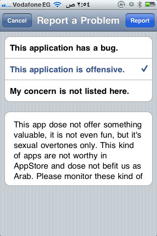 يعني تقدم بلاغ لمشرفي المتجر في ابل ان هذا البرنامج فيه مشكلة ثم تبلغهم ان المشكلة هي ان البرنامج مسيء