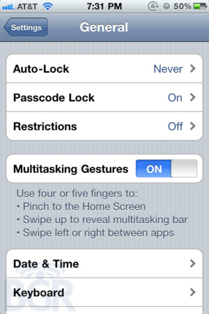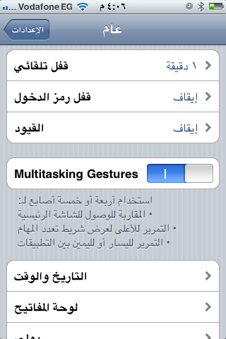 - اذهب الي الاعدادات ثم قائمة الاعدادت العامة ستجد خيار جديد باسم Multitasking Gestures