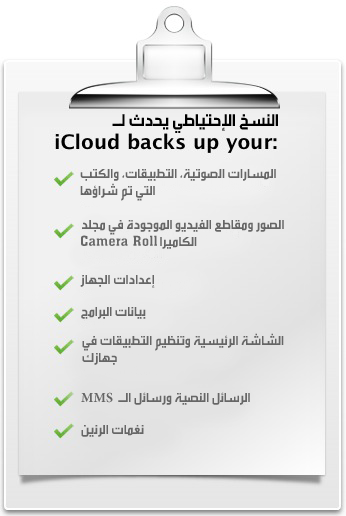 التطبيقات، الكتب، المستندات، وحتى الإعدادات أصبحت جميعها قابلة للتزامن فخدمة iCloud ستجعلك مطمئناً من أن جميع أجهزتك تحتوي على نفس التطبيقات والكتب والمستندات، كما ستمكنك من عمل باك آب ”Backup” لبياناتك وإعداداتك، فإذا مافقدت جهازك فإنك لن تخسر بياناتك.