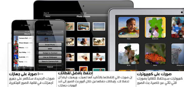 صورك في كل أجهزتك وفي نفس اللحظة، فعندما تلتقط صورة من أحد أجهزة الـ iOS أو عندما تقوم باستيراد أحد الصور على كمبيوترك من خلال الكاميرا الرقمية التي تملكها فإن هذه الصورة ستتواجد على باقي أجهزتك في نفس اللحظة وبشكل فوري في مكتبة الصور الموجودة على أجهزة iOS أو برنامج iPhoto الموجود على أجهزة الماك، أو في مكتبة الصور على جهاز الـ PC أو حتى في قائمة Photo Stream Album على جهاز Apple TV. (هذه الخاصية تتطلب إتصال WiFi أو إتصال عبر شبكة الـ Ethernet.