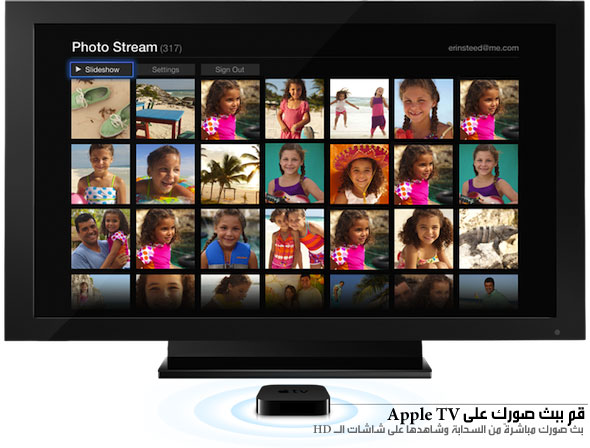 من خلال خاصية بث الصور وجهاز Apple TV يمكنك رؤية صور لحظاتك السعيدة على الشاشات الفائقة الدقة Full HD، ألبوم بث الصور سيمكنك من الإبحار في لقطاتك المحفوظة في السحابة iCloud.
