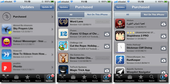 هذه الخاصية برغم انها رائعة ومميزة حتى تتذكر دائماً جميع تطبيقاتك التي اشتريتها من قبل الا انها أغضبت الكثير من المستخدمين خاصة ان آبل اضافتها على الاجهزة الحالية دون اي خيار للمستخدم وستمكن هذه الخاصية كل المشاركين معك في نفس حساب أيتيونز الإطلاع على التطبيقات التي قمت بتحميلها من خلال الذهاب إلى قائمة المشتريات في تطبيق متجر البرامج ورؤية جميع تطبيقاتك التي كنت قد حملتها مسبقاً حتى وإن كنت قد حذفتها من جهازك. فان كنت تشارك حسابك مع احد افراد اسرتك مثلاً سيكون لديهم القدرة على امتلاك نفس البرامج التي تقوم بتثبيتها فوراً لذلك عليك مراعاة ماتقوم بتحميله، فهذه الخاصية قد تحتاج منك بعض الحذر أثناء القيام بتنزيل التطبيقات، خاصة إن كانت أجهزة أبنائك تحتوي على نفس حساب الآيتونز الخاص بك وقد لاتتفق تطبيقاتك مع مرحلتهم العمرية.
