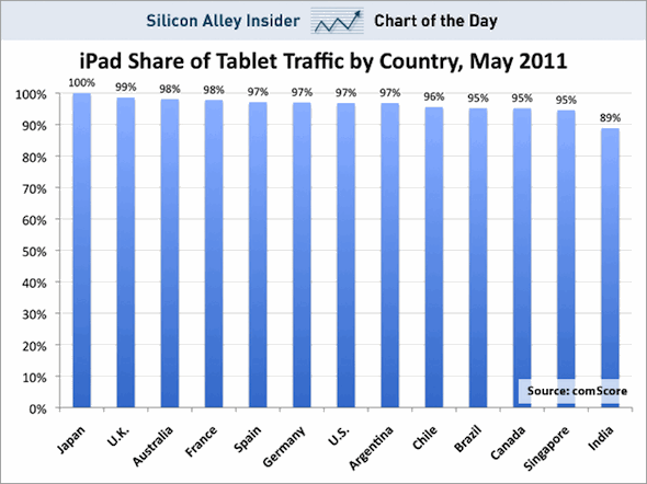 أما إذا أمعنا النظر في جهاز الآي باد نجد أنه سيطر بقوة على سوق التابلت، فقد سجلت أجهزة التابلت العاملة بنظام iOS مايساوي 100% من إجمالي نسبة تصفح الإنترنت على أجهزة التابلت في سوق اليابان معقل صناعة التكنولوجيا، ومايساوي %97 من السوق الأمريكي، وما ينسبته %99 من سوق المملكة المتحدة. (أما نصيب تصفح الإنترنت من خلال الآي باد فيزيد عن %89 من سوق التابلت العالمي). لقد باعت أبل من الآي باد مايزيد عن 25 مليون جهاز حتى الآن ويعتقد أن يتم بيع 14 مليون جهاز آخر في خلال الربع الحالي من العام.