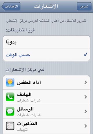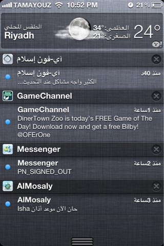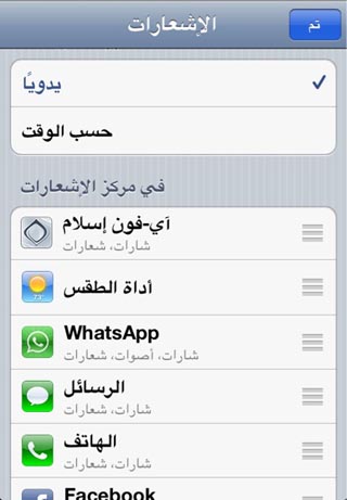 كما ترى فإن الترتيب للإشعارات جاء الطقس ثم برنامج أي-فون إسلام لكن لو عكسناها ستظهر هكذا ما عليك إلا سحب مع عدم الإفلات للخطوط الثلاث و ترتيبها حسب رغبتك.