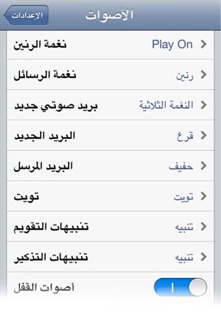 تغيرت القائمة إذ بإمكانك تخصيص نغمة لكل واحدة على حدة إذ كانت مقتصرة على الرنين فقط وأيضا حيث كان سابقا إما تشغيل أو إيقاف أما ألان فتستطيع تخصيص نغمة أو إضافة نغمة مخصصة من برنامج الايتونز