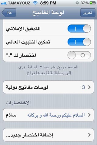 1- في هذه القائمة تم إضافة تحديثات جديد ومميزة وأولها هو إضافة ” الاختصارات ” أي بإمكانك كتابة اختصار لجملة معينة مثل ( سلام – السلام عليكم ورحمة الله وبركاته ) أي عند كتابة كلمة سلام يكتب العبارة كاملة كل ماعليك فعله هو ( الضغط على إضافة اختصار جديد – ثم اكتب الاختصار الذي تريد )