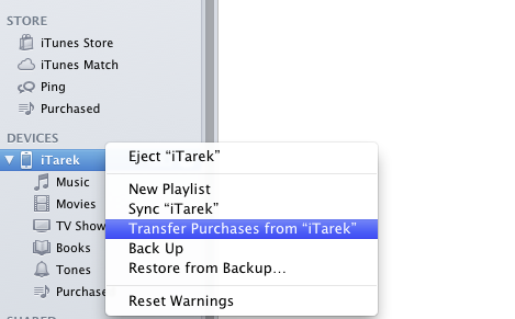 5- نقل جميع التطبيقات المشتراه من هاتفك إلى الآي تونز لتتمكن من إعادتها إلى جهازك بعد تحميل النظام الجديد وذلك بالضغط على زر الماوس الآيمن واختيار Transfer Purchases كما في الصورة التالية