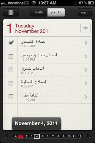 يمكنك التنقل بين الشهور عن طريق السحب لاعلي او لأسفل وعند الوصول للشهر المطلوب فقط قم بلمس اي يوم لينتقل له ويعرض لك المسجل به أو لتسجيل جديد. كما يوجد امكانية البحث في التذكيرات المسجلة. اما في حالة الرغبة في معرفة التذكيرات المكتملة فهي الصفحة الموجودة اقصي يسار قائمة التذكيرات وتحتوي علي المهام المكتملة اما عن طريق وضعك علاقة صح بجاورها او التي انتهي الوقت المحدد لها.