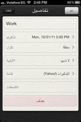 من خانة تكرار تستطيع تكرار التذكير بشكل يومي او اسبوعي او شهر او سنوي ومن خانة الأولية تستطيع تحديد مدي اولوية التذكير التي قمت بتسجيله واما خانة قائمة فهي تهمك اذا كنت تقوم بمزامنة التذكيرات في عدة حسابات مثل السحابية والياهو والجي ميل فلو كان لديكم اكثر من قائمة يمكنك تحديد وضع التنبية الذي تقوم بكتابتة في اي قائمة.