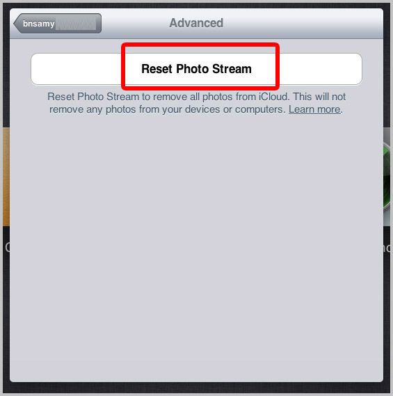 4- قم بالضغط علي Reset Photo Stream وهذة سوف تقوم بمسح جميع الصور بالموقع