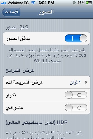 إذا اردت ان تقوم بتفعيل او إغلاق خاصية تدفق الصور إذهب إلى إعدادات ثم صور وفعل او غغلق تدفق الصور.