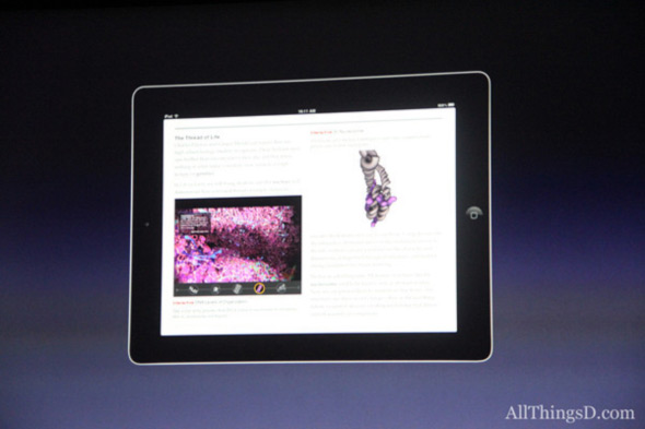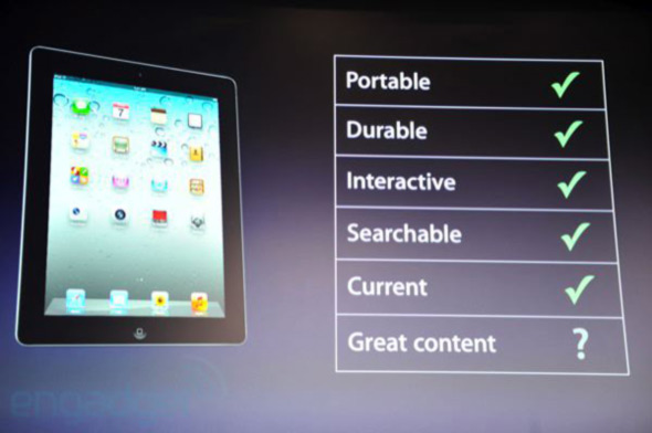ثم فكرت أبل في الآي باد ووجدت انه يوفر مرونه عاليه للغايه وشكل جذاب وحجم صغير ويمكنك البحث في محتواه بسهوله وهو ايضاً متوافر معك في كل مكان لسهوله نقله لكن ماذا بالنسبه لنقطه المحتوى الكبير الذي يتوافر بالكتب التقليديه؟