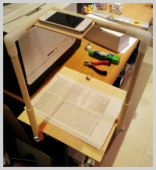 في البداية لم تتعدى الفكرة أبعد من صناعة حامل للآيفون بحيث يزيل الحاجة لمسكه باليد بذلك أزيل الاهتزازات اليدوية، فقمت بصناعة قاعدة خشبية، توجهت لشركة أيس هاردوير (Ace Hardware)، واشتريت قطع خشبية المخصصة للهوايات، وأسرعت راجعا للمنزل، وبدأت بقطع الأخشاب باستخدام أدوات النحت للهاوين، لم تكن المهمة سهلة لعدم تخصصي في الخشب، ولكني توصلت بالنتيجة النهائية إلى قاعدة بسيطة كما هو موضح في الصورة التي على الجانب الأيسر (طبعا اعتبر نفسك لم تلاحظ الطابعة والماسح الضوئي لشركة الإيتشبي على يسار الماسح الآيفوني). لاحظ الآيفون في الأعلى، ولاحظ الورقة في الأسفل، الخطة نجحت، فرمل! كانت هناك مشكلة، حينما أضغط على زر التصوير على الآيفون يتسبب اصبعي باهتزاز الصورة، الخشب لم يكن كافيا لأن يوقف تذبذب الصورة، وإن قلل منه بشكل كبير، إذن، لم تنته المشكلة بعد، أحتاج لأن أجعل التصوير أوتوماتيكا.