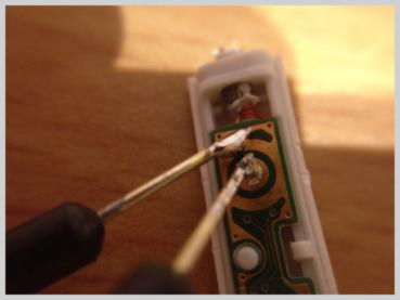 بسرعة خاطفة أمسكت بسماعات الأذن، وبدأت بفك الغطاء الذي يغطي الأزرار، ستجد أن تحت تلك الأغطية هناك أزرة معدنية دائرية تنثني تحت الضغط، أزلت هذه أيضا فتوصلت لسلكين مُوصلين على الدائرة، هذا ما كنت أبحث عنه، كل ما علي فعله الآن هو أن ألحم سلكين على هذين الموصلين، وإذا ما لامست السلكين بعضهما البعض، كليك، الكاميرا تصور، وهذا ما حدث بالفعل بعد أن قمت بالعملية، وأسميها بعملية لأنها كانت متعبة نوعا ما، حيث أن المنطقة هذه حساسة، وإن تتعرض حرارة اللاحم لفترة طويلة قد لا تعمل (خصوصا أن بها إلكترونيات دقيقة جدا)، والشيء الآخر المتعب هو أن السلكين كانا من الصغر بحيث يصعب تركيب أسلاك عليهما، على اليسار صورة مكبرة باستخدام عدسات تبين السلكين الصغيرين.