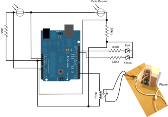 الآن أستطيع بناء دائرتي بسلام وإطمئنان، الصورة التي في الأسفل تبين خريطة الدائرة. لاحظ أن هناك مجموعة أخرى من الأشياء التي لم أذكرها بعد، وأولها الأضواء (أو الصمام ثنائي باعث للضوء – اسم طويل ومزعج ولكن يُقصد به الـ LED)، أولا هناك اثنان من الأضواء، واحد أحمر والآخر أصفر، الأحمر يضيء حينما لا توضع الورقة بالشكل الصحيح، والضوء الأصفر يدل على أن الأمور على ما يرام، وأن الآيفون سيأخذ الصورة الآن، لذلك انتظر حتى يتم التصوير، بعد أن ينطفئ الضوء الأصفر يمكنك إزالة الورقة ووضع أخرى إن شئت. والشيء الآخر وهو الزر الذي أسفل الأضواء، وهو زر الإعدادات، ماذا أقصد بذلك؟ بكل بساطة، شدة الضوء تختلف من غرفة إلى أخرى، لو أنك أردت أن تصور أوراق في غرف مختلفة فذلك قد يسبب مشكلة للماسح الآيفوني لو لم يتم إعادة تعيير المقاوماتين الضوئيتين بحسب الإضاءة في الغرفة الأخرى، ذلك سيتم عن طريق البرمجة، وسأشرح الفكرة بعد قليل (أما الآن تستطيع الاستمتاع بالنظر للدائرة، وسنعود بعد الفاصل).