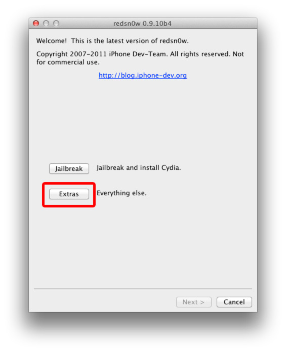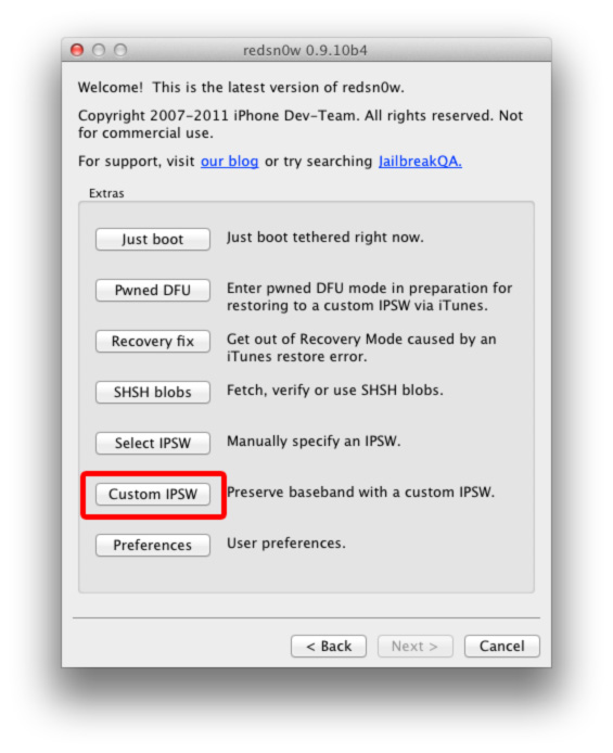 - قم بالترقية عن طريق ملف تحديث معدل ولن ترقى البيس باند فيمكنك فتح الشبكة وتستطيع عمل هذا الملف كما انظر هذه المقالة وهى خاصة بالماك فقط أو من خلال تطبيق Redsn0w وتستطيع تحميلة من هنا للويندوز او هنا للماك وذلك كما بالصور التاليه: