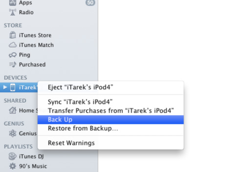 - قم بقراءة هذه المقالة جيداً ويجب ان تقوم بعمل نسخة احتياطية Back Up وذلك عن طريق الضغط بزر الفأرة الايمن على اسم جهازكفي تطبيق أيتونز ثم تحتار Back Up كما بالصورة التاليه: