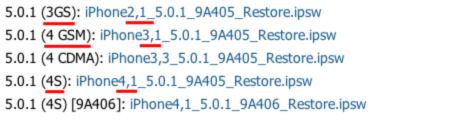 - لاحظ أن شيفرة أبل تختلف في التسمية عن الأسماء التى نعرفها فتجد الملف الخاص بالآي فون 4 يبدأ برقم 3 والآي فون 3GS يبدأ بالرقم 2 والآي فون 4S يبدأ بالرقم 4 رغم انه خامس هاتف، هذا هو أسلوب أبل في تسمية ملفات النظام وليس خطأ منا في وضع الملفات كما يعلق البعض.