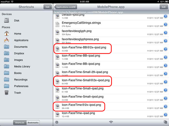 ايضاً قام فريق أخر بدراسة ملفات نظام iOS 5.0.1 للأي باد ووجدوا ان بعض ملفات الرسوم في تطبيق الفيس تايم بالآي باد 2 بدقة مضاعفة واسمها يدل على شاشات الريتنا باسم (Icon-FaceTime-BB@2x~ipad) وكما يظهر من العبارة السابقة 2X اي يوجد فيس تايم بضعف الحجم وهذا يؤكد ما سبق بأعلى.