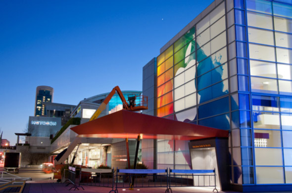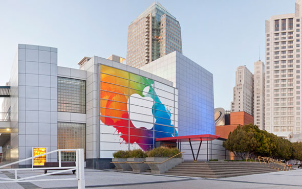 تحدثنا سابقاً عن إهتمام أبل بعنصر الجمال في كل ما يحيط بها، وعرضنا صور لأشهر متاجر أبل حول العالم والتى تبدوا فيها كقطع فنية رائعة، الآن كما يعلم الجميع ان أبل سوف تقدم مؤتمر مساء يوم الأربعاء ( التاسعة بتوقيت مكة ) لتعلن فيه عن الآي باد 3، وقبل هذا الموعد بإسبوع بدأت أبل تحضر للمؤتمر بتجهيز مركز “يربا بوينا” للعرض، والتقط المصممون بعض الصور للمبني ولوحظ إنتشار الألوان الزاهية بالمبني كأن أبل تريد إرسال إشارة تأكيدية لشاشة الريتنا بالآي باد 3 ودقة ألوانها.