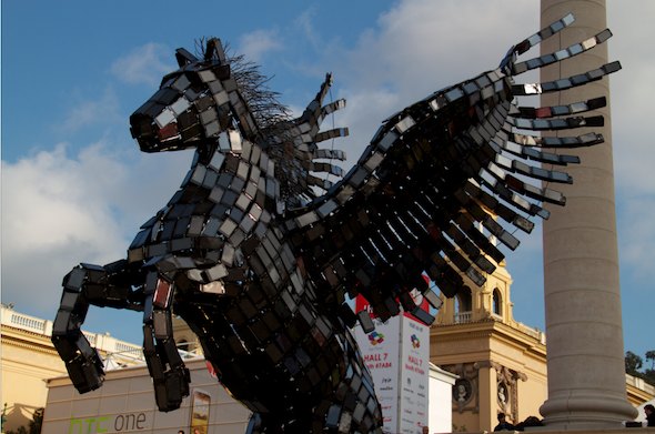 مؤتمر MWC 2012 ليس مجرد مؤتمر يعرض فيه أحدث الإبداعات في مجال الهواتف الذكية، لكنه أيضاً يعتبر متحف للهواتف، شركة هواوي الصينية الشهيرة التي تعتبر أكبر شركة في مجال الشبكات والإتصالات بالصين قررت أن تقدم مفاجئة للمعرض بتصنيع تمثال للحيوان الأسطوري اليوناني القديم بيجيسوس Pegasus وذلك بإستخدام 3500 هاتف ذكي، والغريب بالفعل أن شكلة جميل، إستغرق حوالي 720 ساعة عمل ويبلغ طولة 5 أمتار وعرضة 80 سم وجناحين 4 امتار. نحفة رائعة من شركة هواوي العملاقة والتى أعلنت عن عدة هواتف رائعة ومفاجئة للجميع بالمؤتمر وبعضها احتوى على أسرع معالج بالمعالج.