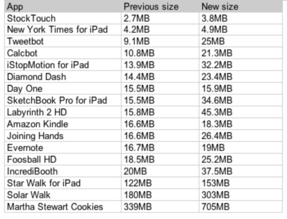 لماذا هذه الزيادة الكبيرة في حجم التطبيق، السبب هو الحجم الرهيب لشاشة الريتنا وإضافة كل صورة بهذا الحجم بالإضافة لكل محتويات التطبيق السابقة وفي حالة وجود فيديو فيجب تعديل جودة الفيديو أيضاً لأن حجم الشاشة الجديد الكبير يجعل الفيديو التقليدي لا يظهر بنفس الجوده المعتادة، وهذا هو سبب زيادة المساحات في التطبيقات. لكن تطبيقات أبل حصلت على تحديثات لإضافة مزايا بجانب دعم الريتنا الجديد فمثلا تطبيق iMovie يعتبر صاحب أكبر تغير في الحجم حيث أصبح 404 ميجا وهذا لأنه بالإضافة لانه ليس فقط يضم صور وازرار يجب تغير حجمها لكن أيضاً يضم مقاطع فيديو ، وقامت أبل بإضافة 17 مقطع صوتي معظمهم ذو مساحة تقارب ال 2 ميجا، وأيضاً هناك أكثر من 180 مقطع فيديو قصير ريتنا تم إضافتهم وهذه الإضافات فقط كانت السبب في زيادة 100 ميجا من التغير السابق.