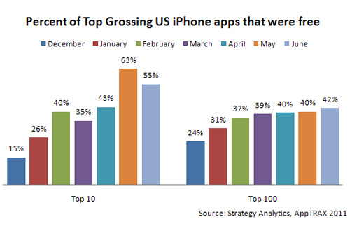 فمثلاً من الصورة السابقه نرى أن التطبيق الأول والثاني هما تطبيقات مجانية لكن إيرادات أي من هما من عمليات الشراء من داخل التطبيق فقط أكثر من إيرادات لعبة الطيور الغاضبة في الفضاء من سعرها (دولار) + إيراداتها من الشراء من داخلها (لفتح مستوى جديد) وهو الأمر الذى يؤكد لنا أن التطبيقات ليست مجانية تماماً وتهدف للربح بطريقة أو بأخرى كما أشرنا من قبل وإذا نظرنا إلى أكثر 10 تطبيقات في قائمة ال Top Grossing ستجد أن 7 تطبيقات منهم مجانية ومن أكثر 25 تطبيقات تجد 17 مجانية و 8 مدفوع (هذه الإحصائية تمت وقت كتابة هذه الأسطر). ويمكن أيضاً مشاهدة احصائية لنسبة التطبيقات المجانية داخل قائمة الأكثر ربحاً في المتجر الأمريكي لعام 2011