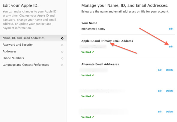 3 قم بتسجيل الدخول في حسابك الحالي وستظهر لك الصفحة الأساسية والتي تستعرض لك بريدك الحالي وكذلك كل الإيميلات المرتبطة به فقم بالضغط على Edit بجوار البريد الأساسي الذي تريد تغييره: