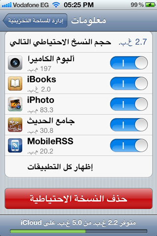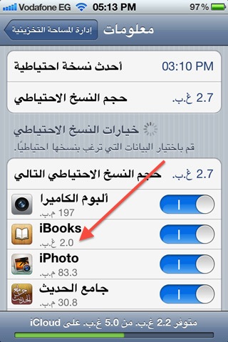 الحل السابق جيد لكنه متاح فقط لمن يملك أكثر من جهاز ولا يريد نسخة منهم، لكن معظمنا يحتاج جميع النسخ ولا يستطيع حذف أي منها، لكن السؤال هل كل حجم النسخة الإحتياطية أنت تحتاجه فعلاً؟ السحابة تقوم بعمل نسخ احتياطية من البيانات الموجودة في كل تطبيقات الجهاز وربما يكون بعضها غير هام ولا تحتاج أن تخزن نسخ احتياطية منه كما أن هناك بعض الملفات قد تخزن مرتين، فمثلا ملفات الصور الخاصه بك الموجوده فى ألبوم الكاميرا يتم عمل نسخة إحتياطية منها وفي نفس الوقت إن فعلت خدمة تدفق الصور ستوجد نسخة آخرى من الصور الملتقطة في آخر 30 يوماً أي أن بعض الصور مخزنة مرتين ويمكن التحكم فى ما يتم حفظه من نسخ احتياطيه عبر الخطوات التالية: