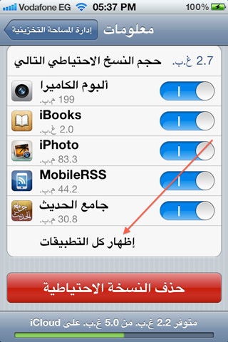 3 ستظهر امامك التطبيقات التى يتم حفظ نسخ منها للآى كلاود لن تظهر كل التطبيقات فاضغط على “إظهار كل التطبيقات”: