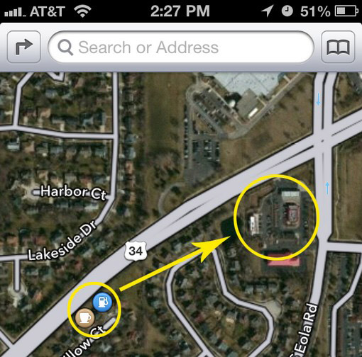 أقرب مكان تمكن خريطة أبل من إظهاره في البحث عن مطار دالاس هو “موقف سيارات الأجرة الخاص بمطار دالاس” ، أحد الأماكن ظهر في الخريطة أنه مستشفى وهو كان كذلك بالفعل لكنه تحول إلى “سوبر ماركت” منذ 11 عام لكن خرائط أبل لم يصلها هذا التغير، تمثال الحرية يكاد لا يظهر في الخريطة لكن يوجد ظل التمثال كما نشاهد في الصورة التالية: