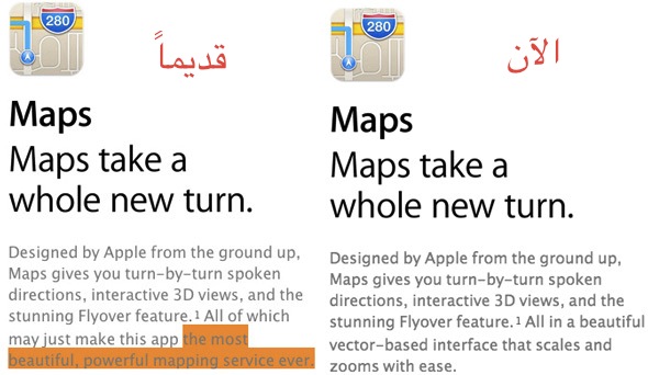 - أبل لم تكتفي فقط بالرسالة بل قامت بتعديل موقعها وإزالة عبارة “خدمة الخرائط الاقوى والأكثر جمالاُ على الإطلاق” التي كانت تضعها على موقعها لأنه ثبت بالتجربة العملية وباعتراف الشركة أن تطبيق خرائط أبل الحالي هو أسوء تطبيق قدمته شركة أبل عبر تاريخها الطويل.