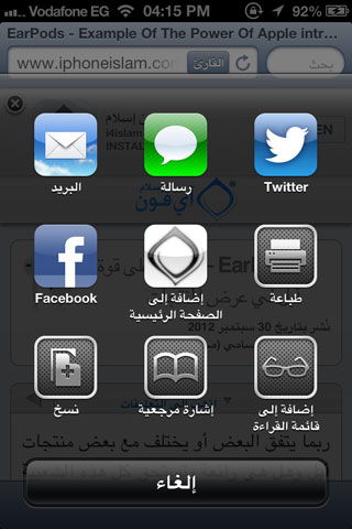 لاستخدام هذه الميزة على جهاز الآي-فون اضغط على زر السهم في أسفل برنامج السفاري ومن ثم اختار إضافة إلى قائمة القراءة.