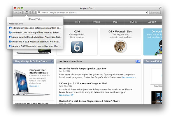 الخدمات السحابية توفر علينا الوقت والجهد، وعند إطلاق خدمة iCloud السحابية تغير مفهوم أجهزتنا من جديد، الآي-كلاود تابز أو التبويبات السحابية ميزة جديدة توفرها لنا أبل عند استخدام متصفح السفاري في النظام الجديد وعند تفعيلها سيتم نقل جميع محتويات متصفحك عبر أجهزتك المختلفة من آي-فون و آي-بود و آي-باد أو حتى عبر أي جهاز ماك يحتوي على نظام OS X Mountain Lion .