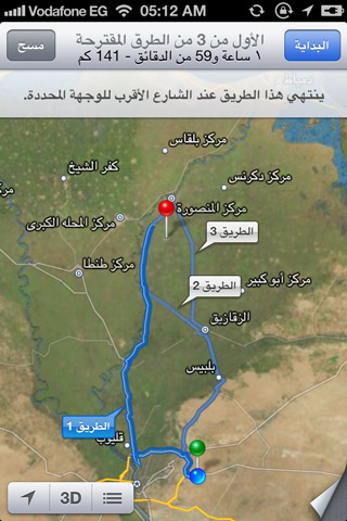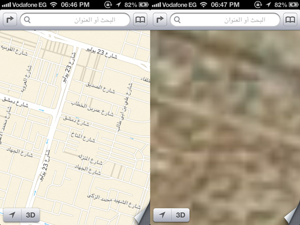 ربما تكون خرائط أبل سيئة في حالة ال 3D أو وضع الأقمار الصناعية لكنها ليست كذلك في حالة الخرائط التقليدية، فمثلاً في عدة محافظات بمصر لن تجد صور أقمار صناعية لهذه المحافظات، لكن عند الانتقال لوضع الخرائط ستجد تفاصيل كبيرة، ويتضح ذلك من الصورة التالية لنفس المدينة بنفس التكبير في حالة الأقمار الصناعية وحالة قياسي “الخرائط”.