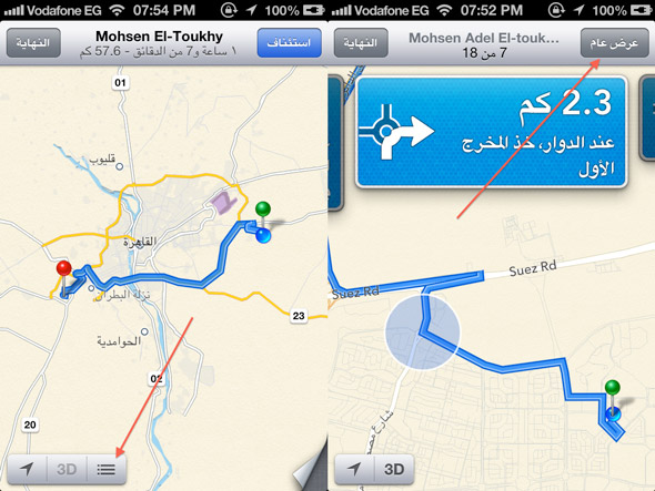 سابقاُ كنتَ تضغط على الأسهم يميناً ويساراً للتنقل بين الخطوات ومشاهدتها، أمّا حالياً فتستطيع التنقل بين الخطوات عن طريق السحب يميناً ويساراً فقط، أما إذا أردت رؤية خطوات الطريق بالكامل فهذا ممكن فقط في حالة العرض العام حيث يجب عليك الضغط على عرض عام أعلى اليمين فتنتقل لرؤية الطريق بالكامل ومن ثم الضغط على علامة الخطوات التي تظهر بجوار 3D