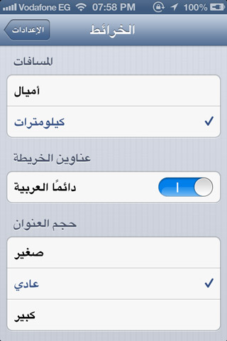 ويمكن اختيار ذلك بالذهاب إلى الإعدادات ثم الخرائط ثم اختيار “دائماُ باللغة العربية”: