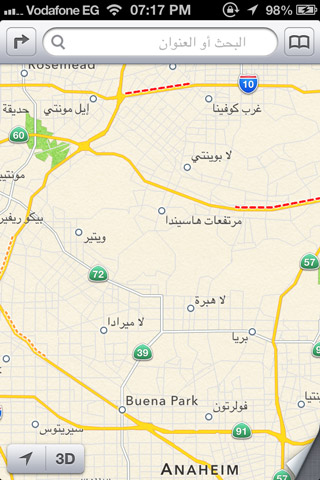 أبل قامت بوضع إعدادات للخرائط بحيث يمكنك اختيار إظهار أسماء الشوارع بلغة محددة فقط وهى لغة الجهاز؛ فمثلاً إذا كانت لغة الجهاز هى العربية واخترت عرض الأسماء باللغة العربية فسوف تظهر لك كل المدن باللغة العربية حتى وإن كانت في الولايات المتحدة مثل الصورة التالية: