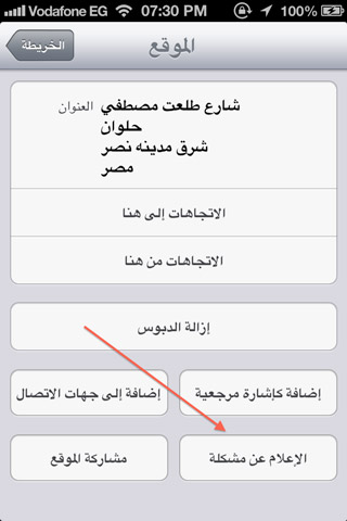 في حالة عثورك على أي خطأ في التطبيق وأردت مساعدة أبل لإصلاحه فقم بوضع دبوس في مكان الخطأ ثم اضغط السهم الصغير واختر “الإعلام عن مشكلة”، ثم سجل المشكلة “يفضل اللغة الإنجليزية” وأرسلها إلى أبل، وطبقاً لتصريح تيم كوك فإنهم يهتمون بكل الملاحظات والمشاكل التي ترسل لكن بالطبع لن يتم إصلاحها سريعاً.