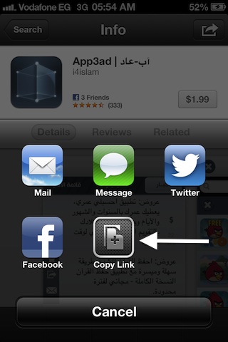 كما ذكرنا فإن الطريقة السابقة تصلح فقط لمستخدمي iOS 6 أما مستخدمي الأنظمة قبل ذلك فعند ذهابهم إلى المتجر وفتح وصف أي تطبيق سيجدوا في الأسفل “Tell a Friend” وهى تمكنك من إخبار أصدقاءك بالتطبيق بواسطة الإيميل فقط ولا يمنحك رابط التطبيق حتى في الرسالة كما لا يمكنك من مشاركته أصدقاءك في الفيس بوك أو تويتر أو برسالة قصيرة ولا بأي طريقة أخرى.