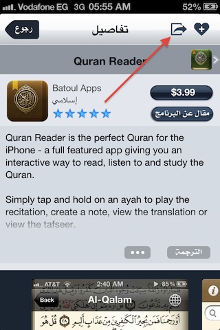 افتح التطبيق المطلوب معرفة الرابط الخاص به ومن أعلى يمين أضغط على زر السهم أعلى اليمين: