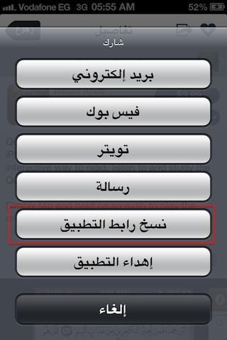 ستظهر لك قائمة تمكنك من الحصول على الرابط وأيضاً مشاركة التطبيق مع اصدقاءك في الفيس بوك وتويتر وبالرسائل القصيرة وغيرها:
