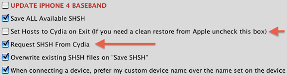 حل المشكلة: قم بتحميل أحدث نسخة من TinyUmbrella من موقعهم عبر هذا الرابط ، ثم قم بتوصيل جهازك وتشغيل التطبيق واذهب إلى “Advanced” وقم بإلغاء الموافقة على الاختياريين الخاصيين بتوجيه الهاتف للبحث عن SHSH في السيديا كما في الصورة التالية: