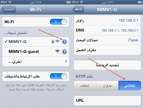 - الأول: تحويل ملقم HTTP للوضع التلقائي وذلك بالذهاب إلى الإعدادات ثم Wifi والضغط على السهم الصغير يمين الشبكة ثم تحويل الملقم من إيقاف إلى تلقائى
